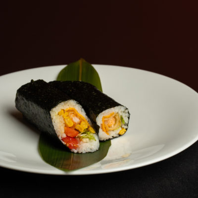 Outside: seaweed, rice; Inside: tempura shrimp, tomato, iceberg lettuce, corn,...